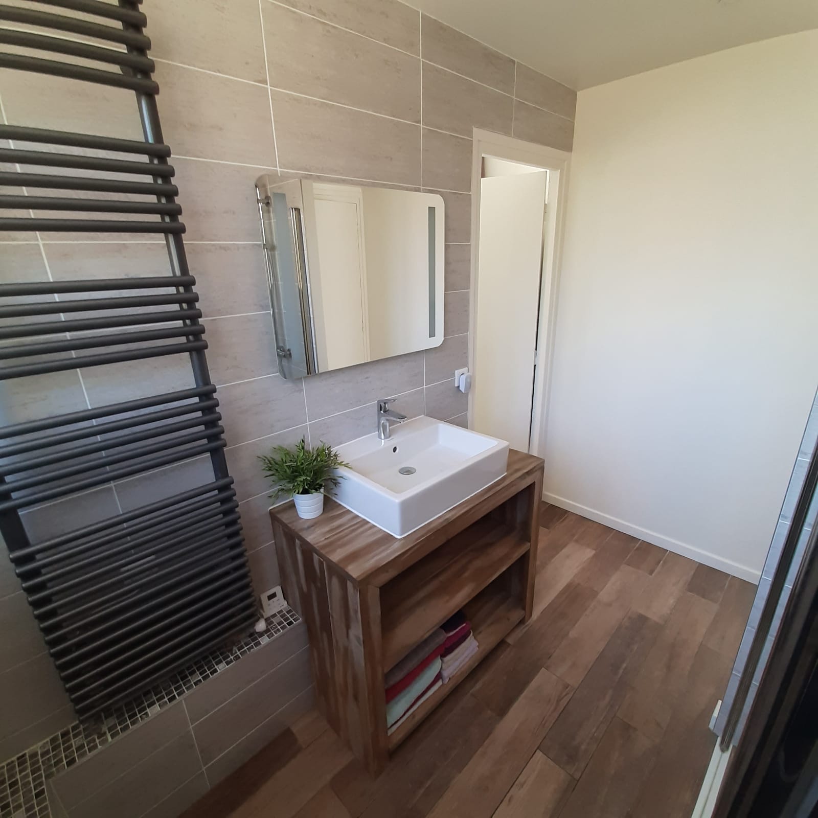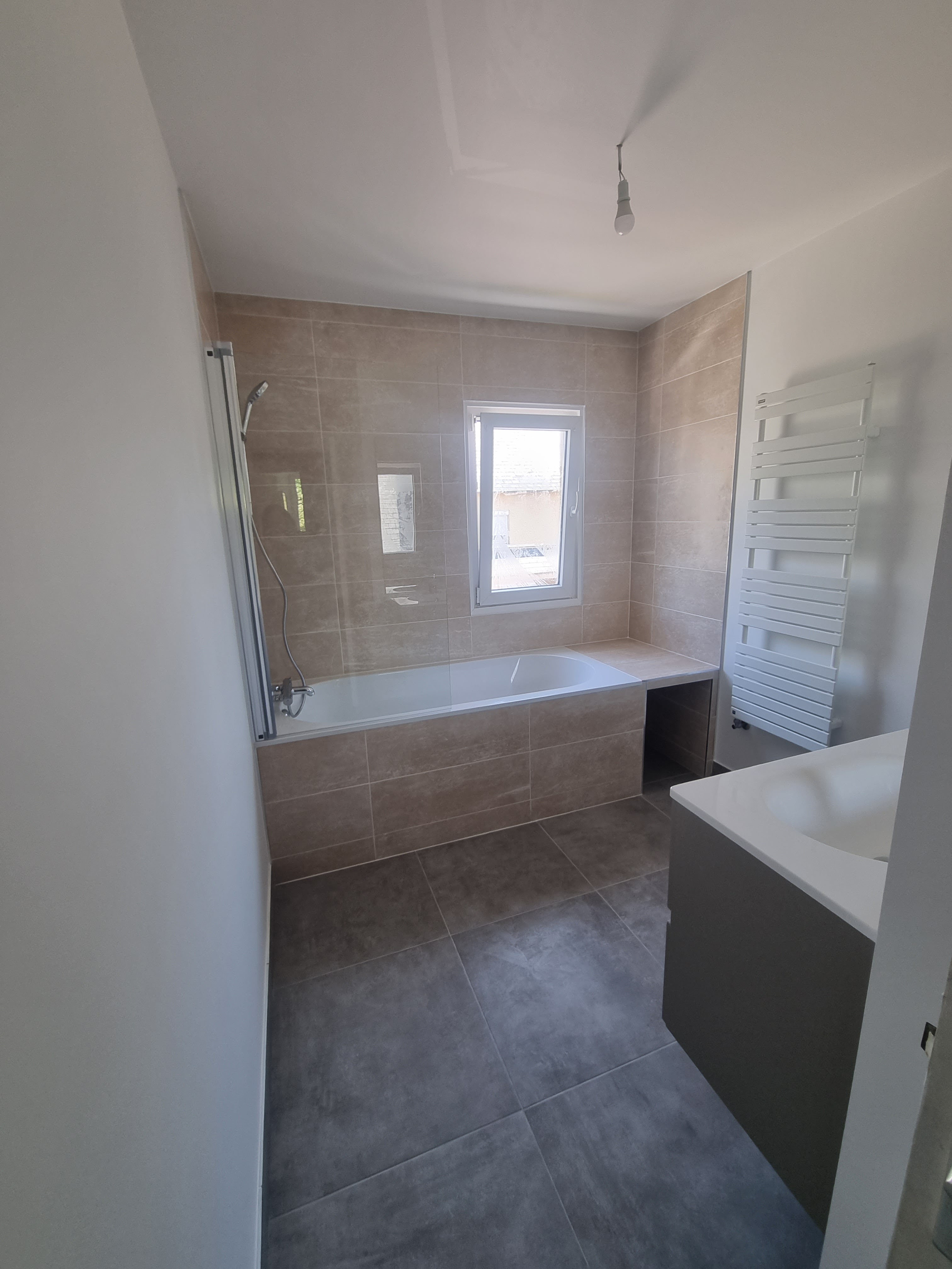 Création complète d'une salle de bain : cloison, Douche à l'italienne, Baignoire, Toilette séparée par porte coulissante, radiateur, plafond, électricité, carrelage. Les travaux ont été très professionnels, ponctuels, soignés, sans aucune surprise Devis temps respectés Nous sommes ravis du résultat et préconisons Mr Plisson, un artisan très professionnel et à l’écoute de nos besoins ( les photos montrent le résultat , une photo afin de montrer la salle de bain avant et deux pendant les travaux)